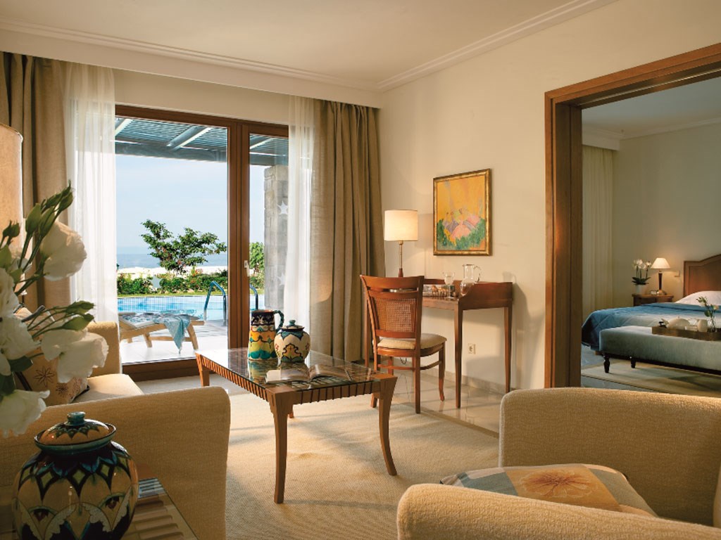 Супериорна соба со поглед на море – Околу 38м2, погодна за 2-3 лица со двојни или двокреветни кревети сместени во спалната соба и посебна дневна соба. Тие се наоѓаат во главната зграда на приземјето и првиот кат и имаат поглед кон морето.