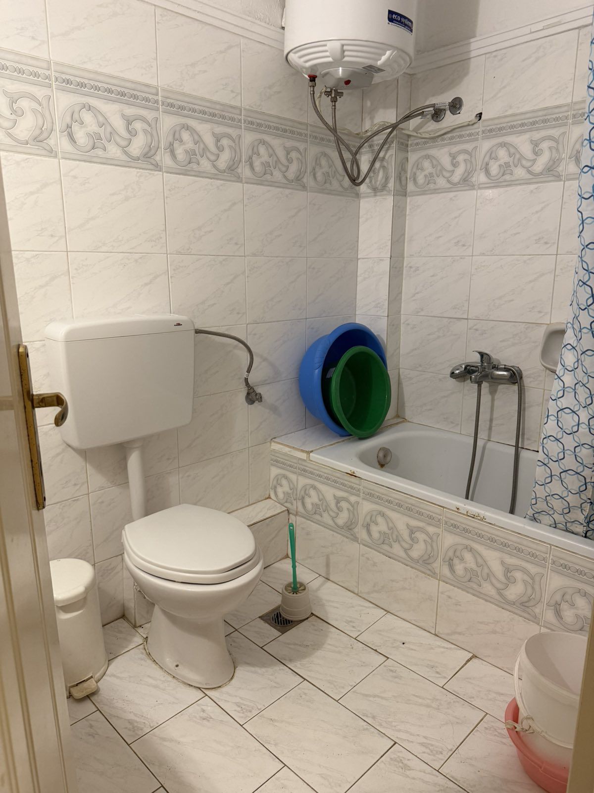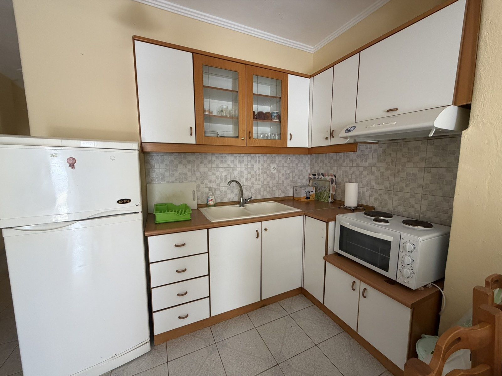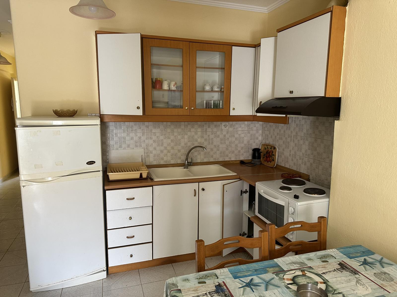1/5 + 1 апартман бр. 1 – прв кат. Простран апартман кој располага со спална соба опремена со брачен кревет и сопствена тераса со поглед кон дворот. Располага со дневната соба и со целосно опремена кујна со сите потребни елемнти (голем фрижидер, мал шпорет со рерна, кујнски прибор, аспиратор и сл.), ТВ и клима уред. Во дневниот простор има еден брачен кревет со помали димензии, еден стандарден кревет и софа на пуштање. Од дневна соба се излегува на пространа тераса со поглед кон улица. Апартманот има сопствено купатило со када.