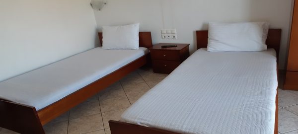 Апартманот располага со една спална, посебна кујна , купатило со WC и многу голема тераса 40М2 со маса и столици. Во спалната соба има еден дупол кревет и мало креветче за дете до 4 год.Од спалната се излегува на тераса.Во спалната е клима уредот ТВ и плакар за алишта.Во кујната има два поединечни кревети.Таа е комлетно опремена со кујнски инвентар,фрижидер,решо со две рингли,респиратор.И од кујната се излегува на тераса. Има сопствено купатило и WC.