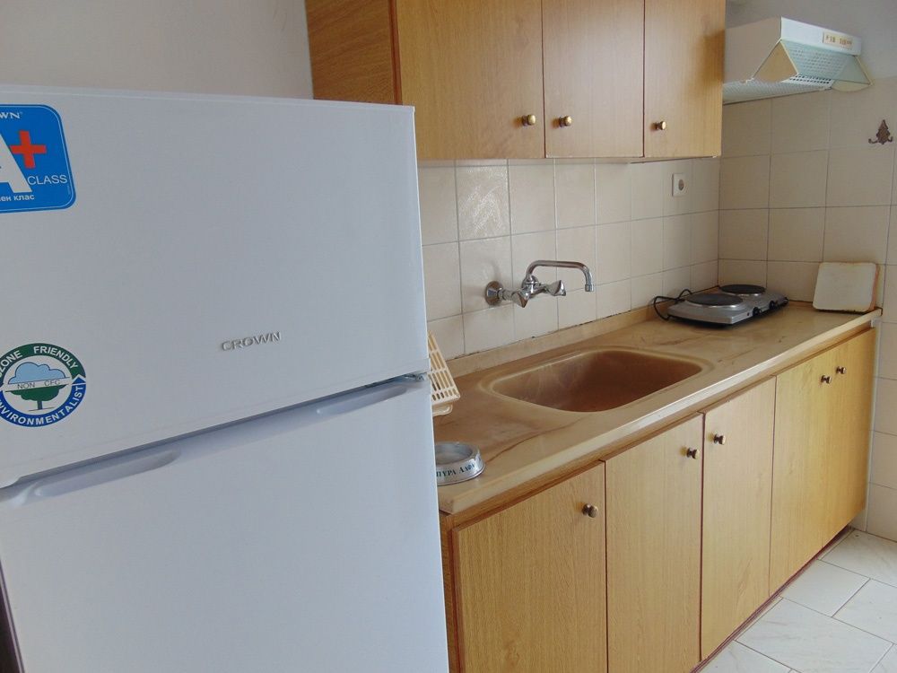 Простран трокреветен апартман со една посебна спална соба одделена со врата од кујната. Се наоѓа на првиот спрат во вилата. Во просторот пред спалната соба на самиот влез во апартманот се поставени елементите од кујната: мини електрично решо, аспиратор, голем фрижидер со одделна комора, садови за готвење и јадење. Од овој простор се влегува во купатилото. Во спалната соба има три единечни кревети со нормални димензии, гардеробер, телевизор и клима уред чие користење е вклучено во цената. Од собата се излегува на пространа тераса која е опремена со пластична маса и столчиња и има директен поглед на море. Собата е заштитена со ролетни и комарници.