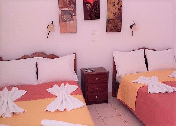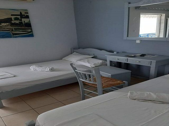 • Трикреветно студио: Лоцирано на 3 кат, еден двоен кревет (потесно од стандардните) + еден единечен, мини кујна со прибор за готвење и јадење, сопствен реновиран тоалет, Wi-Fi, Тераса со страничен поглед кон море и градина, клима уредот е вклучен во цената