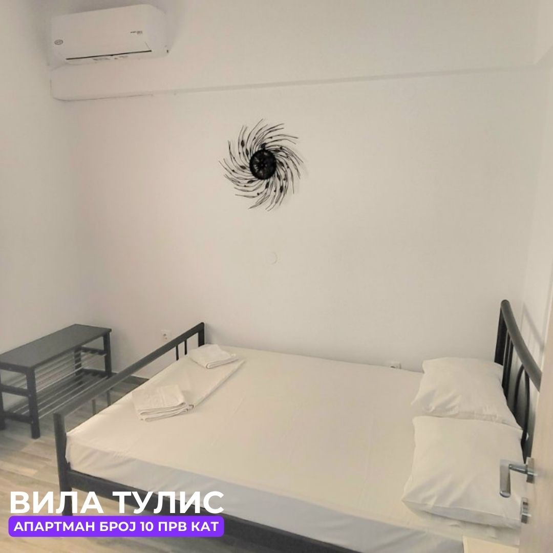 Дуплекс апп бр.10 (ЗА 5 ЛИЦА) – се наоѓа на први кат. Апартманот има комплетно опремена кујна со голем фрижидер, плотна и маса за ручање. Лево се наоѓа тоалетот, а десно има соба со брачен кревет и еден единечен кревет, плакар и тв. Другата соба има брачен кревет и климата. Собата гледа према двор.