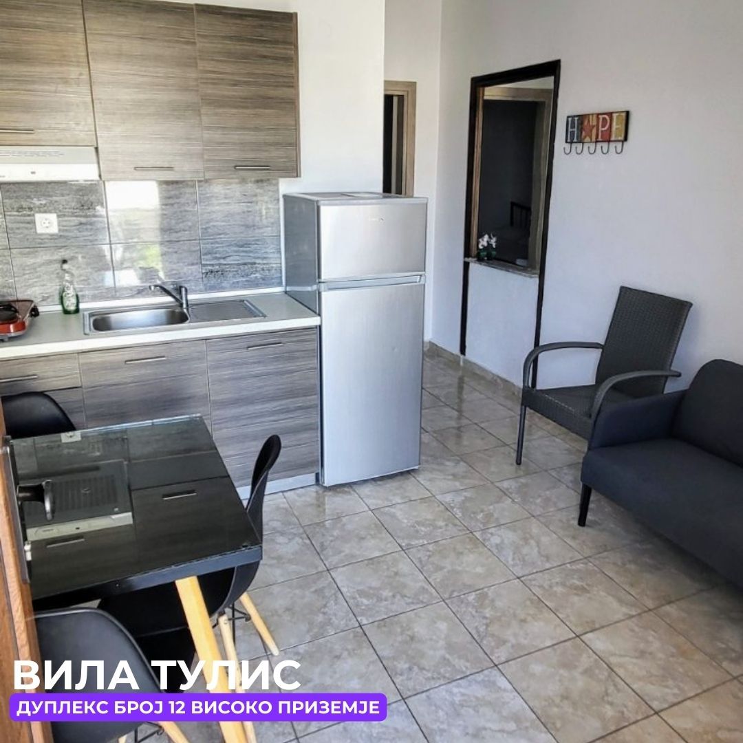 Дуплекс апп бр.1 (ЗА 5 ЛИЦА) – се наоѓа на високо приземје(меѓу кат). Веднаш лево е едната спална соба со брачен кревет, голем плакар, шминкерница и овде е климата. Другата спална соба има брачен кревет и еден единечен кревет, со балкон кој е заеднички со кујната, овде има телевизор. Право е тоалетот, а од десна страна пространа кујна опремена со сите елементи, голем фрижидер и масичка за ручање со тераса со мал поглед на море.