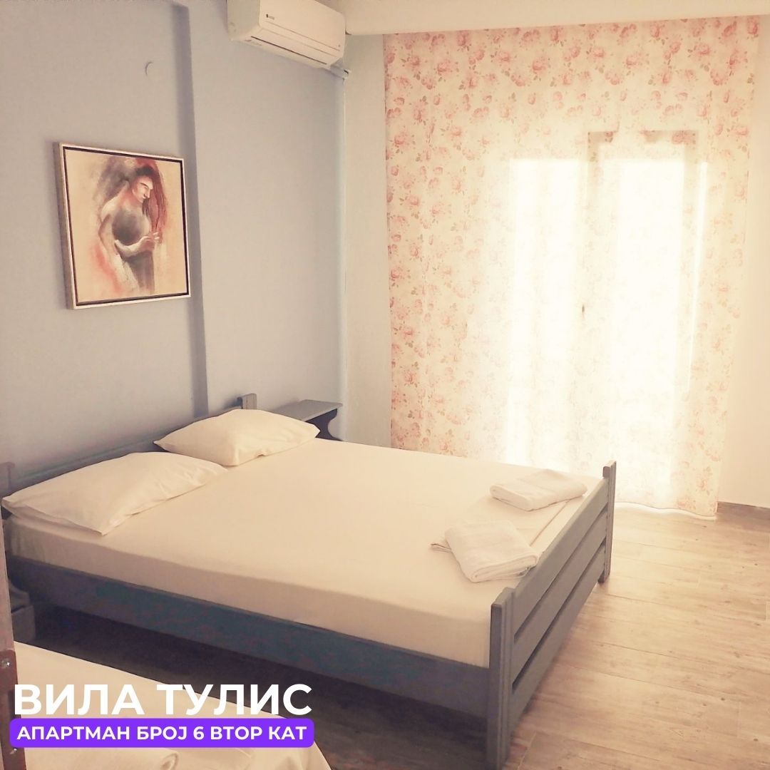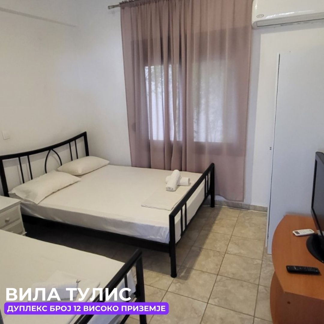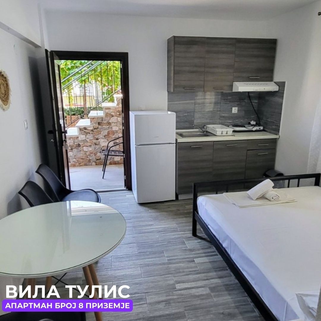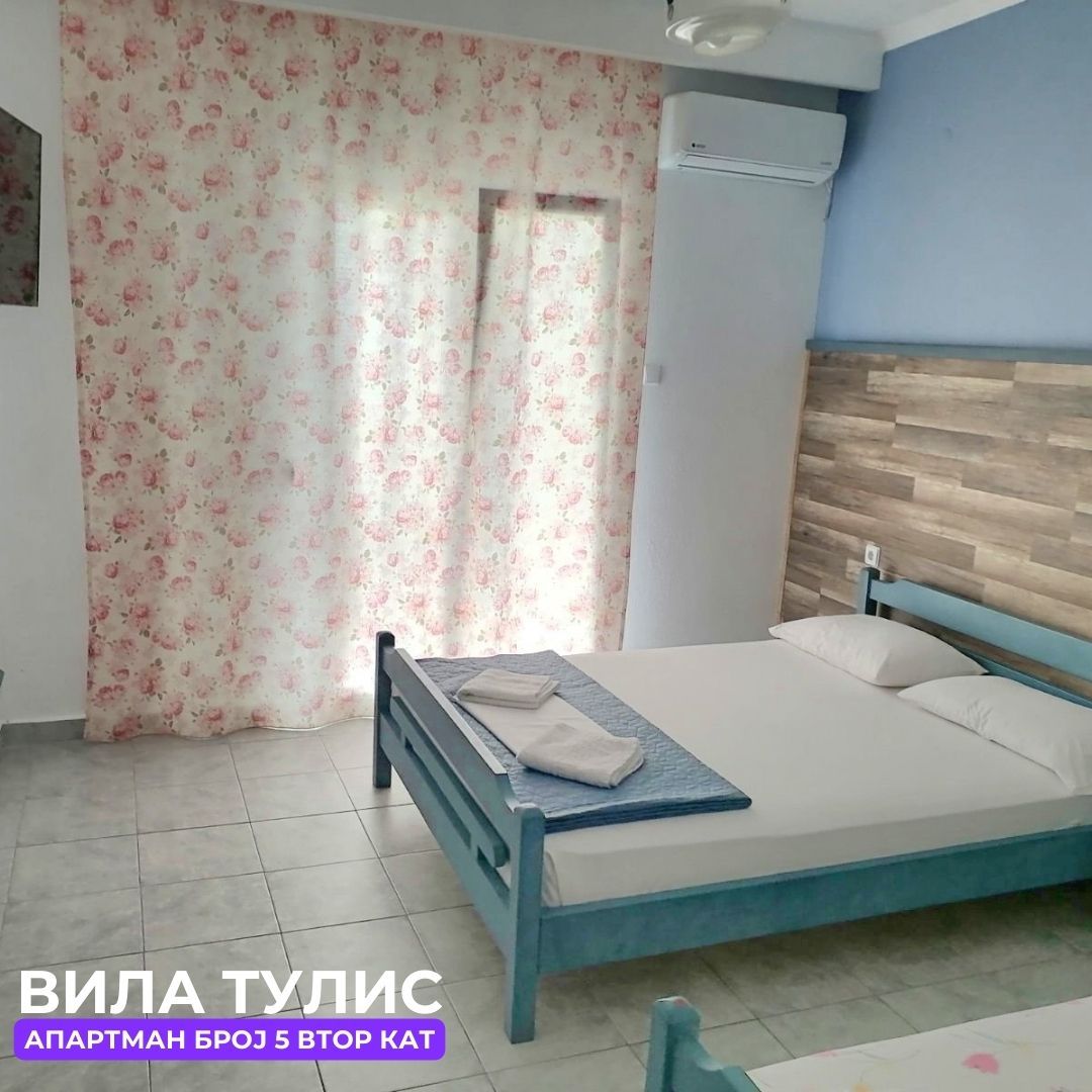 Вила „Тулис“ (целосно реновирана) се наоѓа на 300 метри од плажа во самиот центар на Полихроно, веднаш над црквата. Вилата располага со апартмани за три, четири и дуплекс апартмани за пет лица, комплетно опремени со кујна, тоалет и тераса. За секој апартман има обезбедено приватен бесплатен паркинг, заеднички двор за дружење на гостите, игралиште за кошарка и приватна теретана. Одличен избор за семејства. Сите апартмани се опремени со клима уред чие користење се доплаќа 35 евра за 7 ноќевања на лице место кај газдите на вилата.