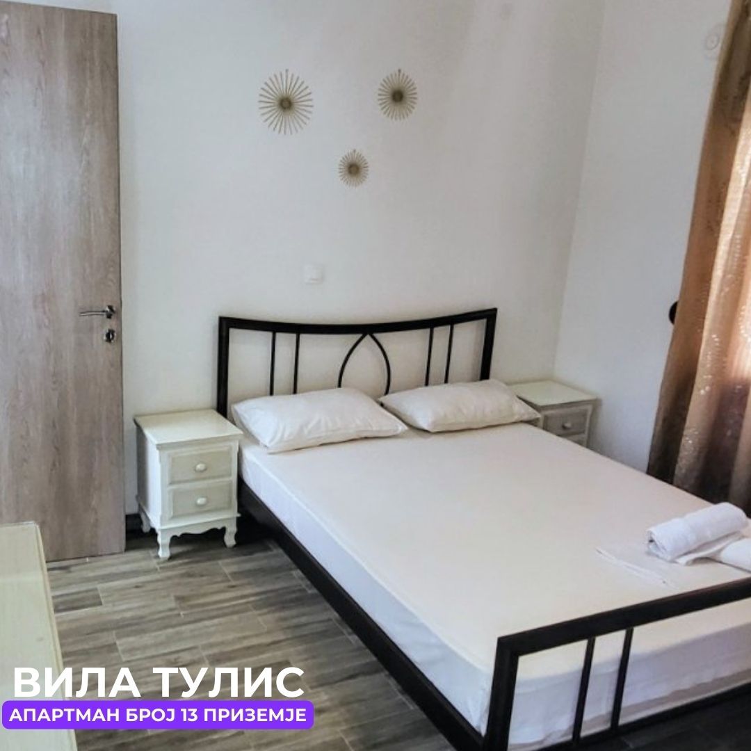 Апп бр.13 (ЗА 3 ЛИЦА) – се наоѓа на приземје. Апартманот има комплетно опремена кујна со голем фрижидер, решо, маса за ручање и софа за спиење во кујна (препорачуваме на софата да спие дете). Тоалетот е десно, а право се наоѓа спалната соба со брачен кревет, шминкерница, тв и клима. Оваа соба има поглед према паркинг и има посебен влез позади.