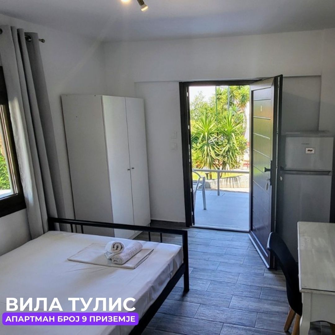 Апп бр.9 (ЗА 4 ЛИЦА) – се наоѓа на приземје, одма до апартман бр. 8. Апартманот има соба со брачен кревет, плакар и фрижидер (голем). Десно е тоалетот со стандардна големина. Во кујната која е комплетно опремена има брачен кревет, масичка за ручање, плотна со две грејни тела, електрично ѓезве за кафе,тв и клима. Спалната и кујната се одделени со врата. Апартманот е ист како апартман број 8.