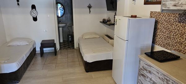 Студиото располага со еден брачен кревет, еден поединечен кревет. Во склопот на собата е кујната која е комплетно опремена со кујнски инвентар. Има електрично решо ,аспиратор и фрижидер. Излегува на комотна тераса со маса и столици и има поглед на море. Студиото има клима уред ,ТВ и стандардно купатило со WC.