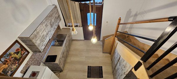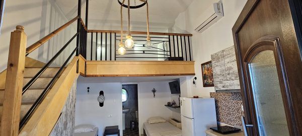 Располага со две спални соби кои се меѓусебно поврзани со внатрешни скали. На долниот кат во спалната соба е кујната која е комплетно опремена со кујнски инвентар, голем фрижидер, електрично решо, аспиратор+дворче .Во долната спална соба има два единечни кревети кои можат да се спојат како дупли кревет, плакар за алишта, клима уред, ТВ .Во другата спална соба која се наоѓа на вториот кат поврзана со внатрешни скали, има два единечни кревети. Апартман-мезонет има стандардно купатило со WC.