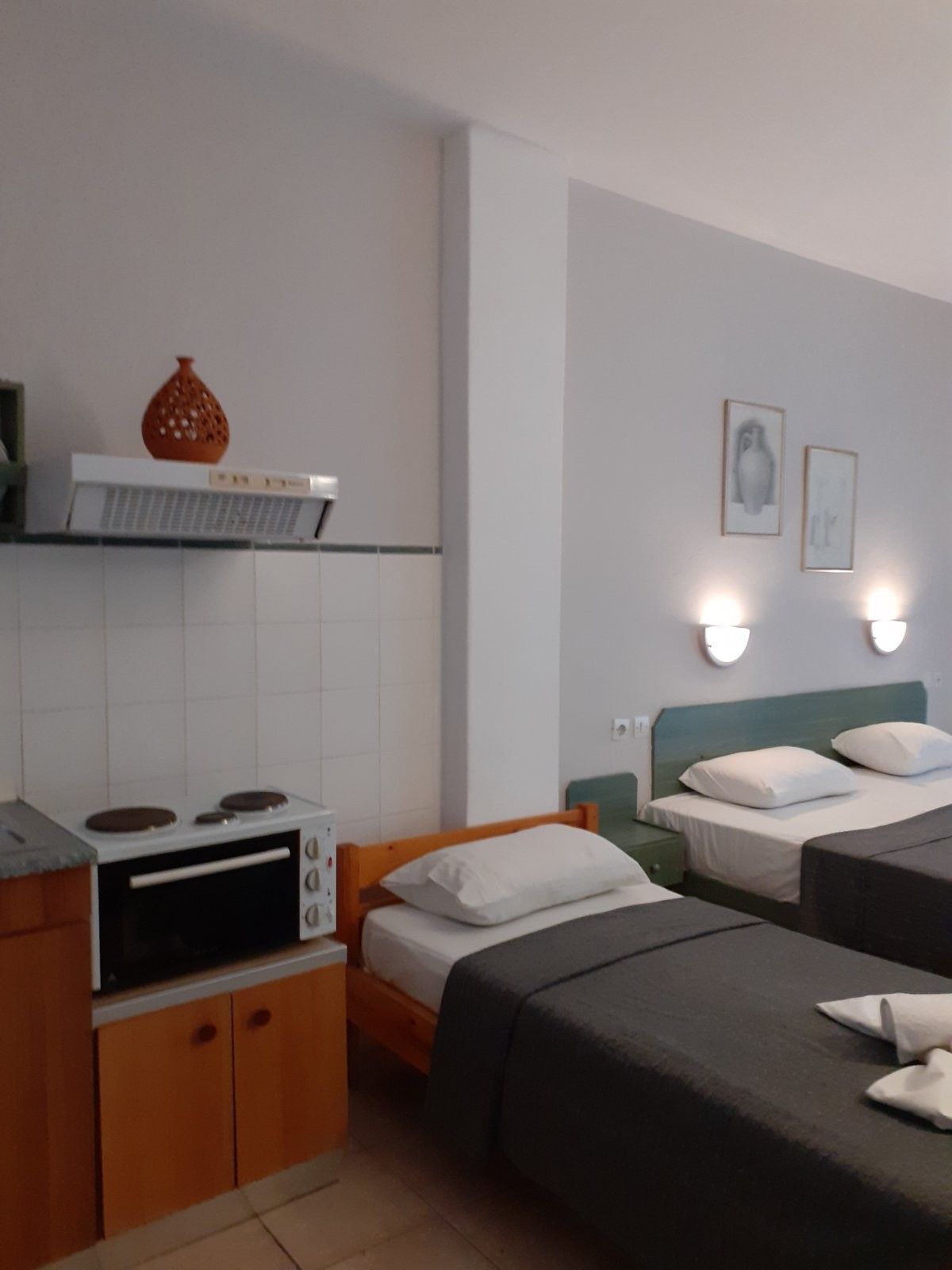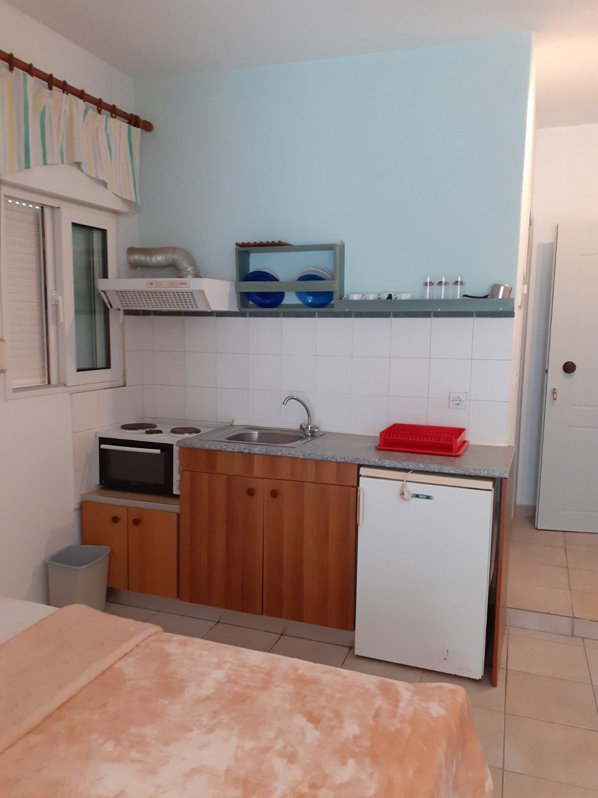 - Студио 3 – 1/2+1 голем француски лежај погоден за сместување на 2 возрасни особи и 1 дете до 12 години, мал фрижидер, опремена кујна, шпорет БЕЗ рерна, основни садови за соодветниот број на лица , ТВ, интернет, купатило, клима, тераса со поглед на двор.