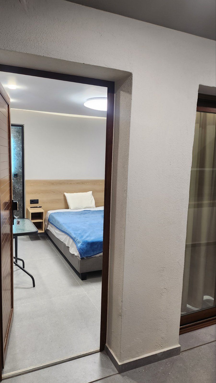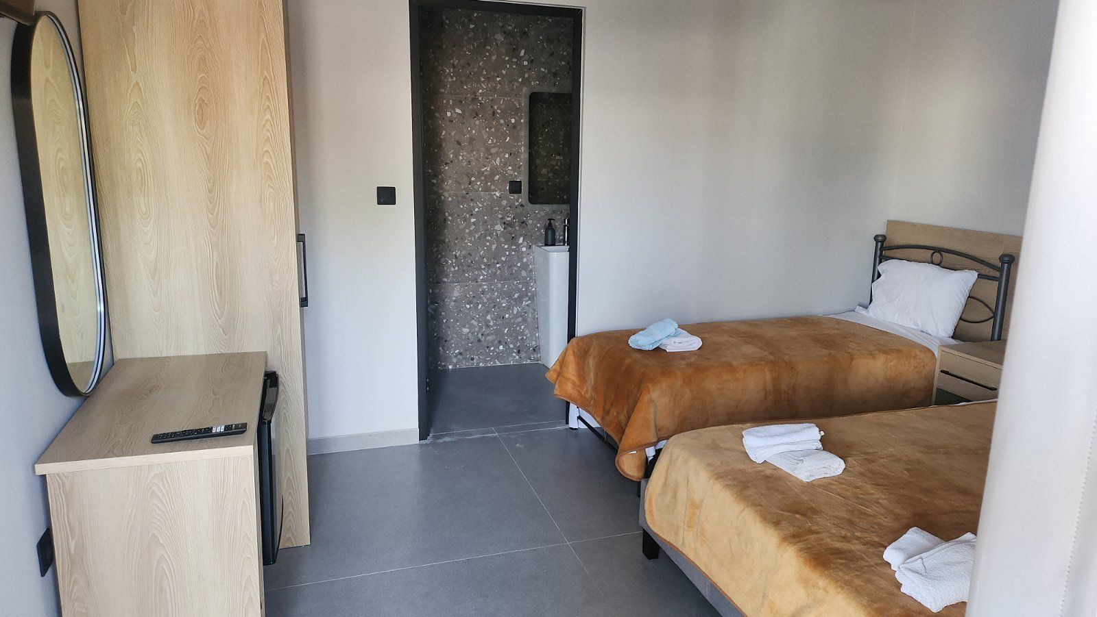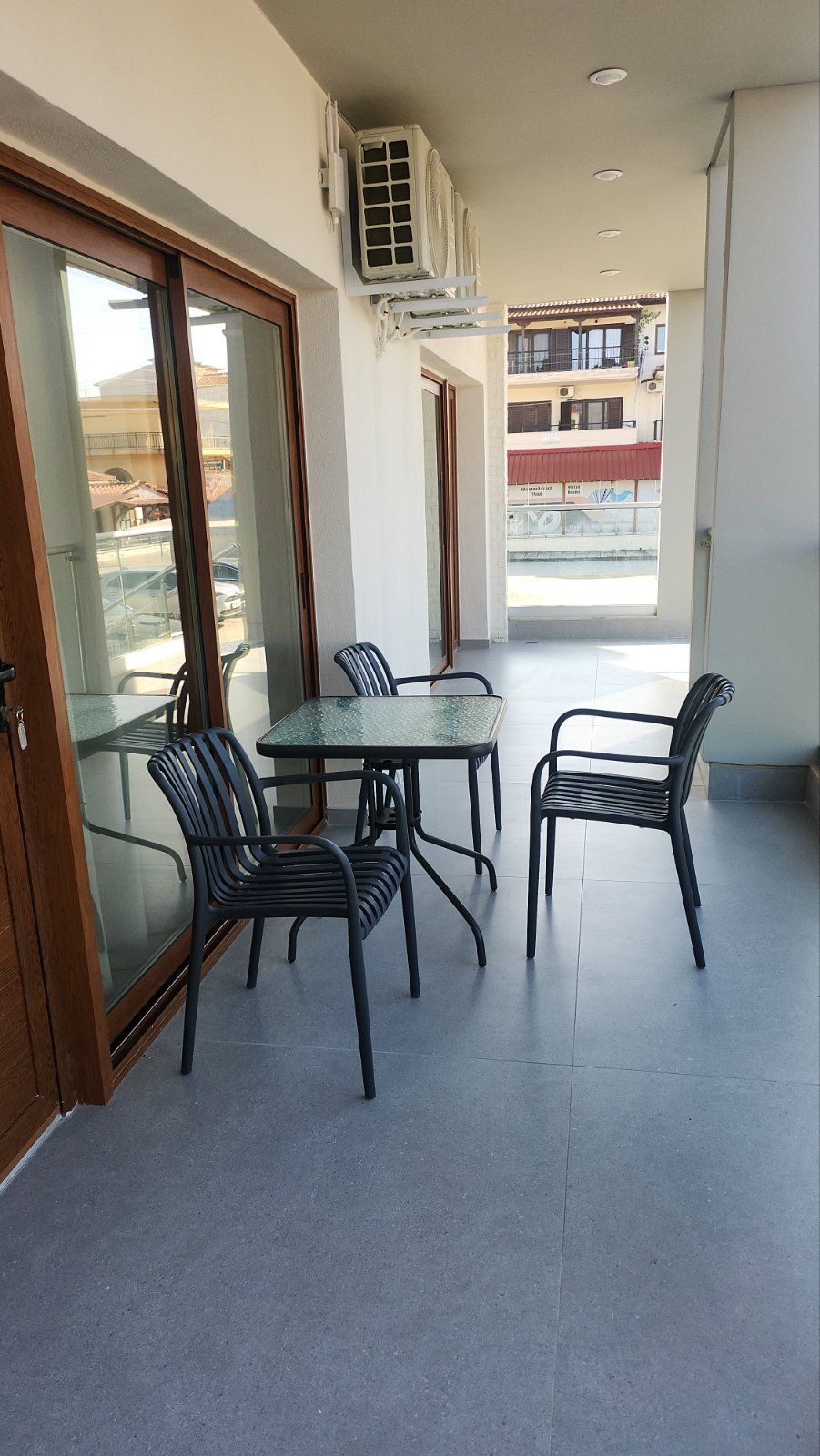 Студио број 8 (1/3)– прв кат. Пространо студио, опремено со квалитетен мебел, комплетно реновиран тоалет, тераса со поглед на главната улица, опремена со маса и столови, клима, ТВ, Wi-Fi. Располага со брачен кревет и 1 стандарден кревет.