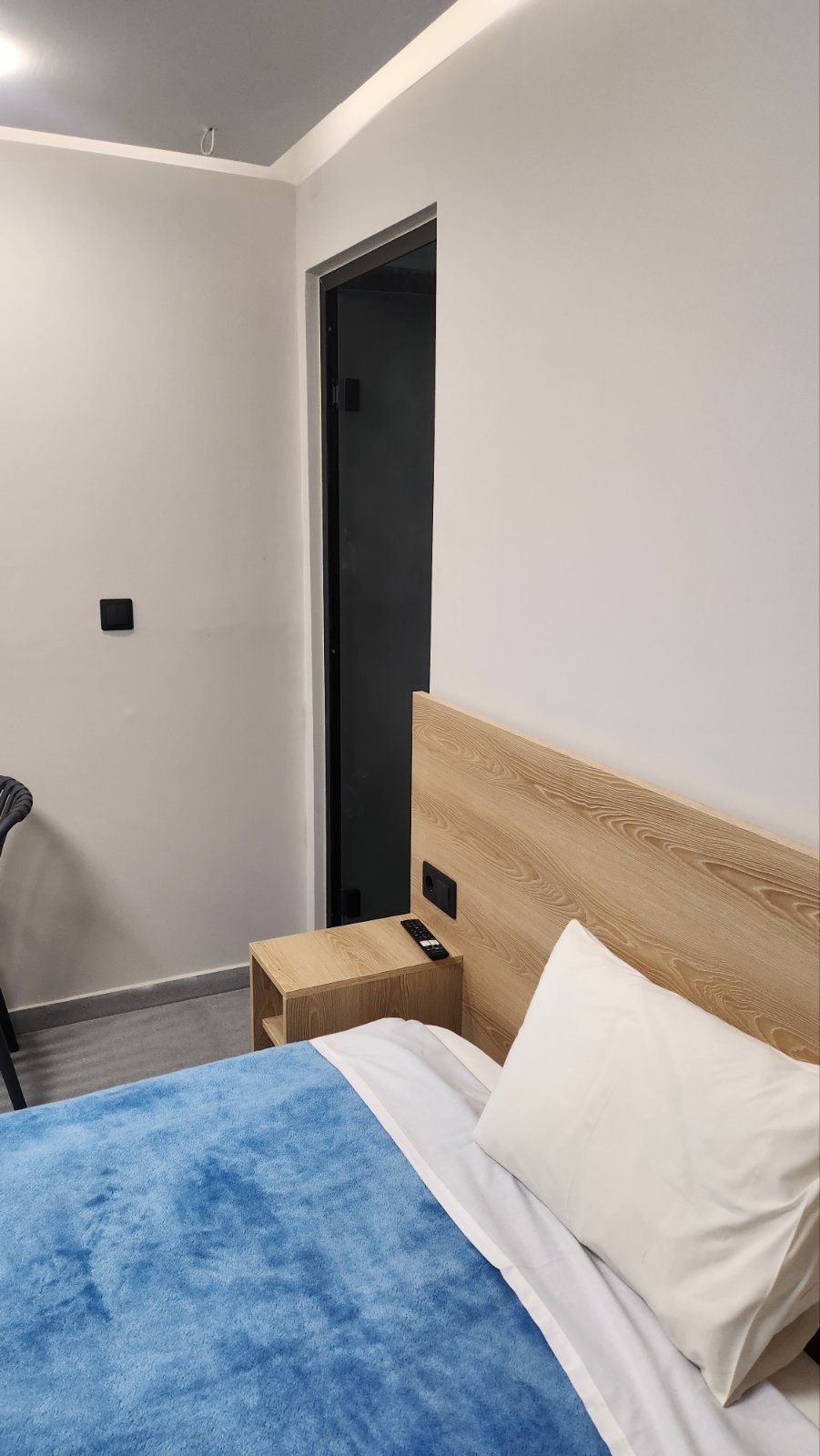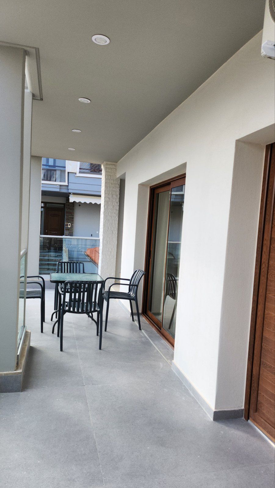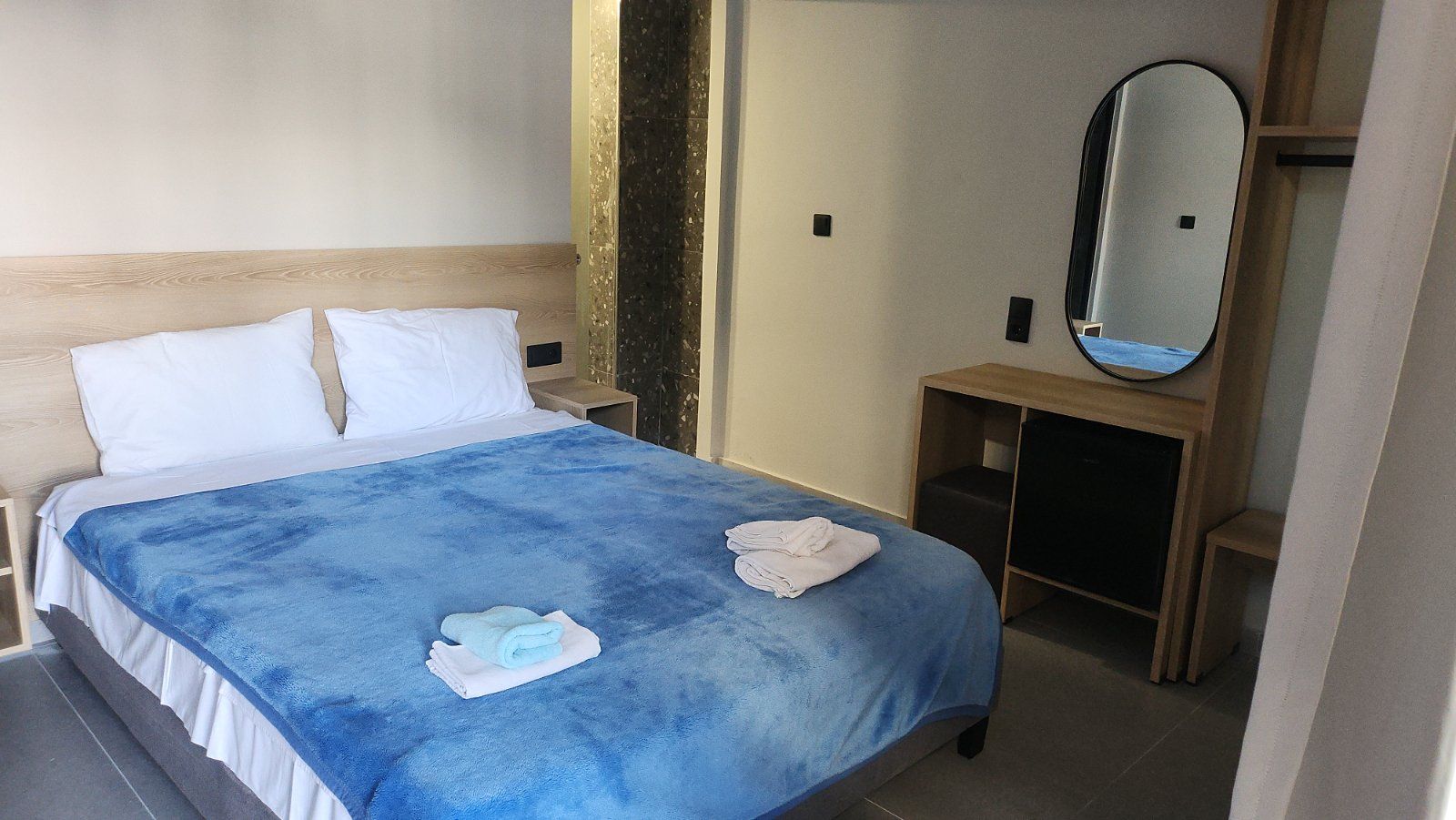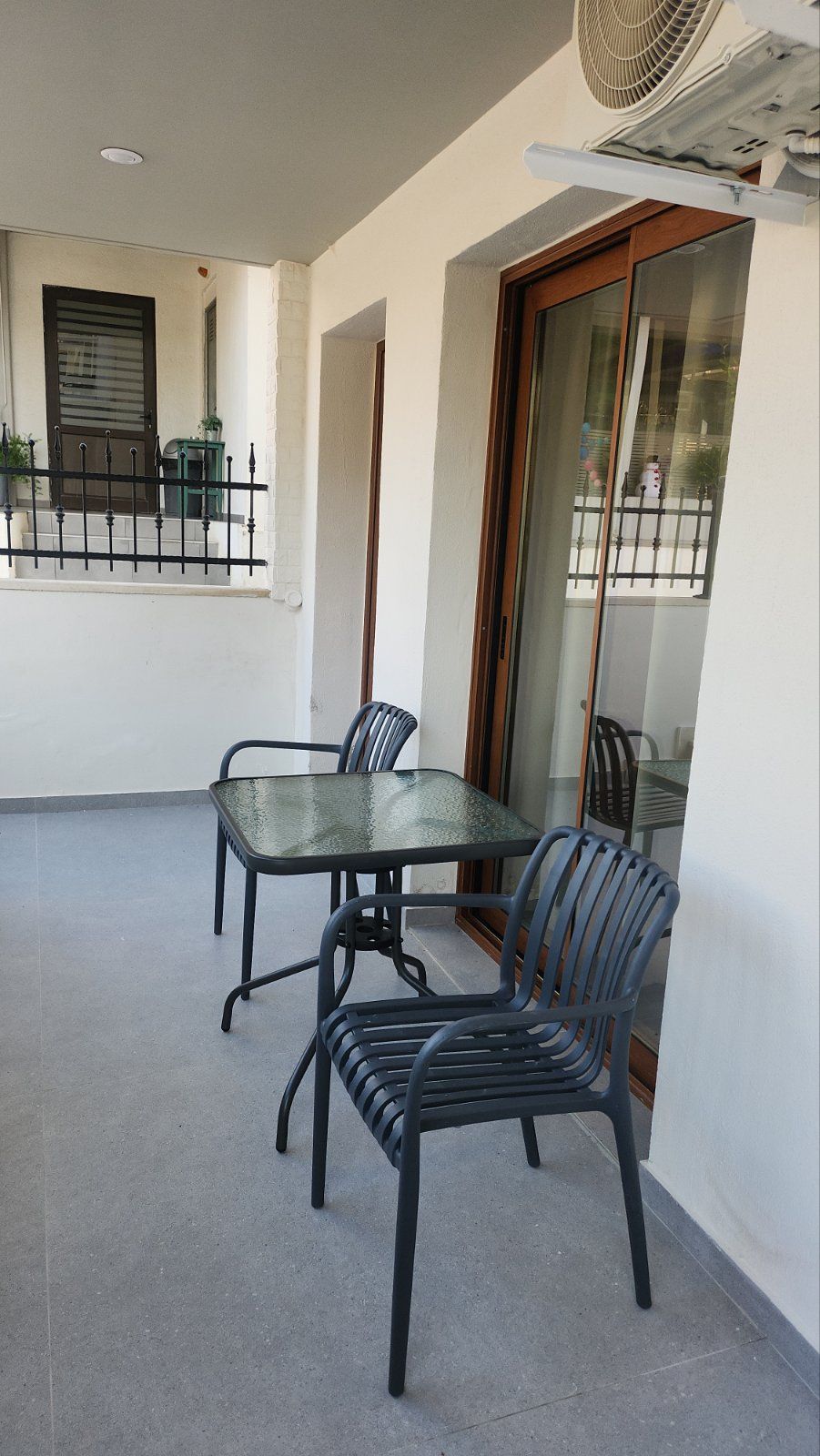 Студио број A1 (1/2) – втор кат. Пространо студио, опремено со квалитетен мебел, комплетно реновиран тоалет, тераса со поглед на задниот дел на вилата, опремена со маса и столови, клима, ТВ, Wi-Fi. Располага со брачен кревет.