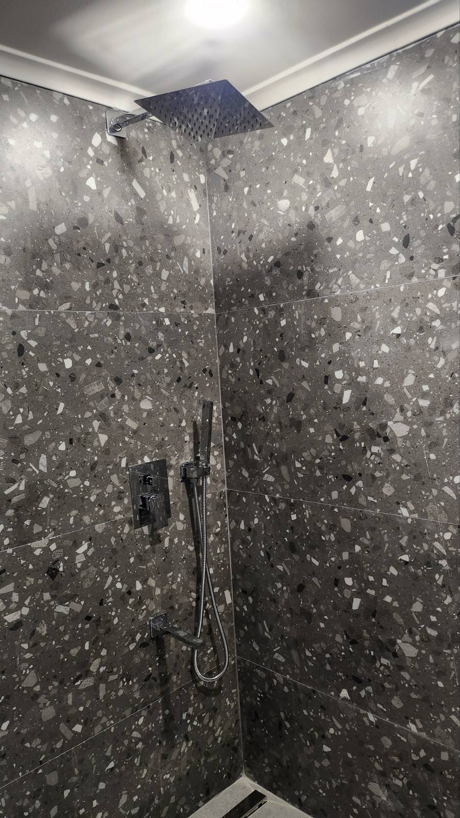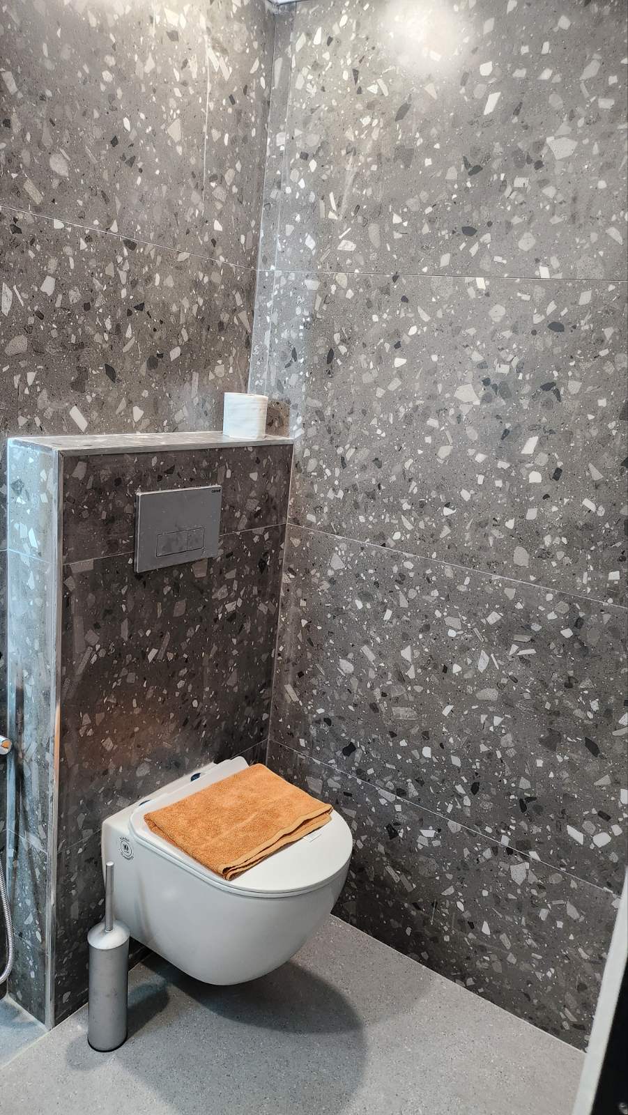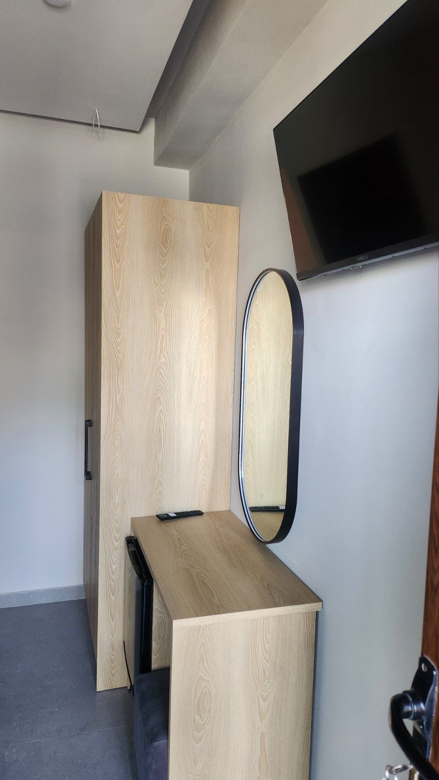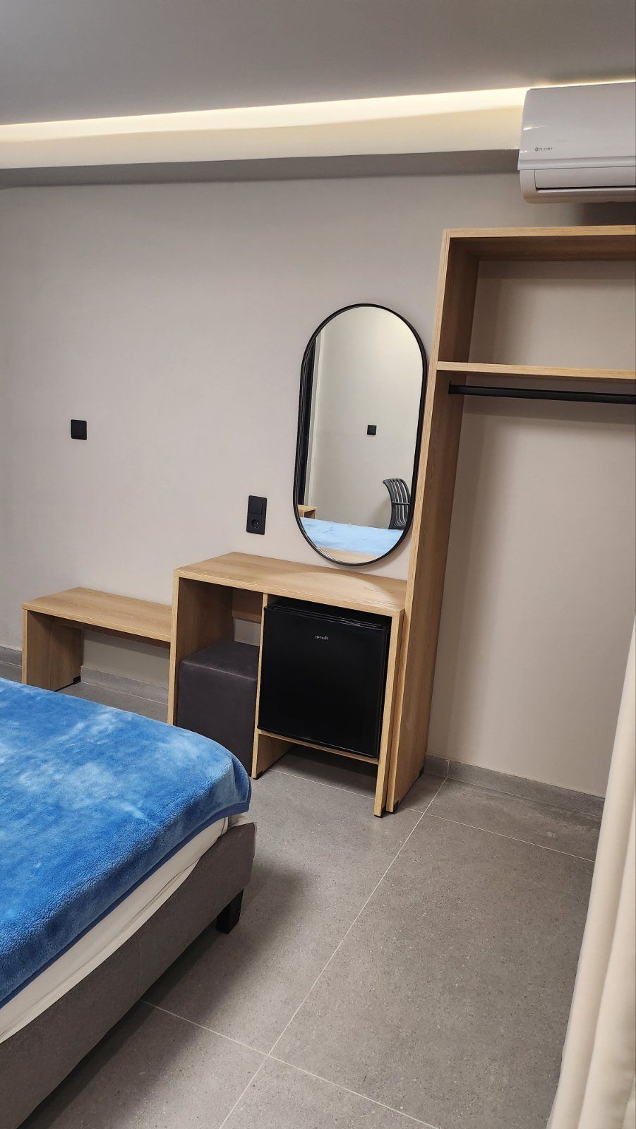 Студио број A1 (1/2) – втор кат. Пространо студио, опремено со квалитетен мебел, комплетно реновиран тоалет, тераса со поглед на задниот дел на вилата, опремена со маса и столови, клима, ТВ, Wi-Fi. Располага со брачен кревет.