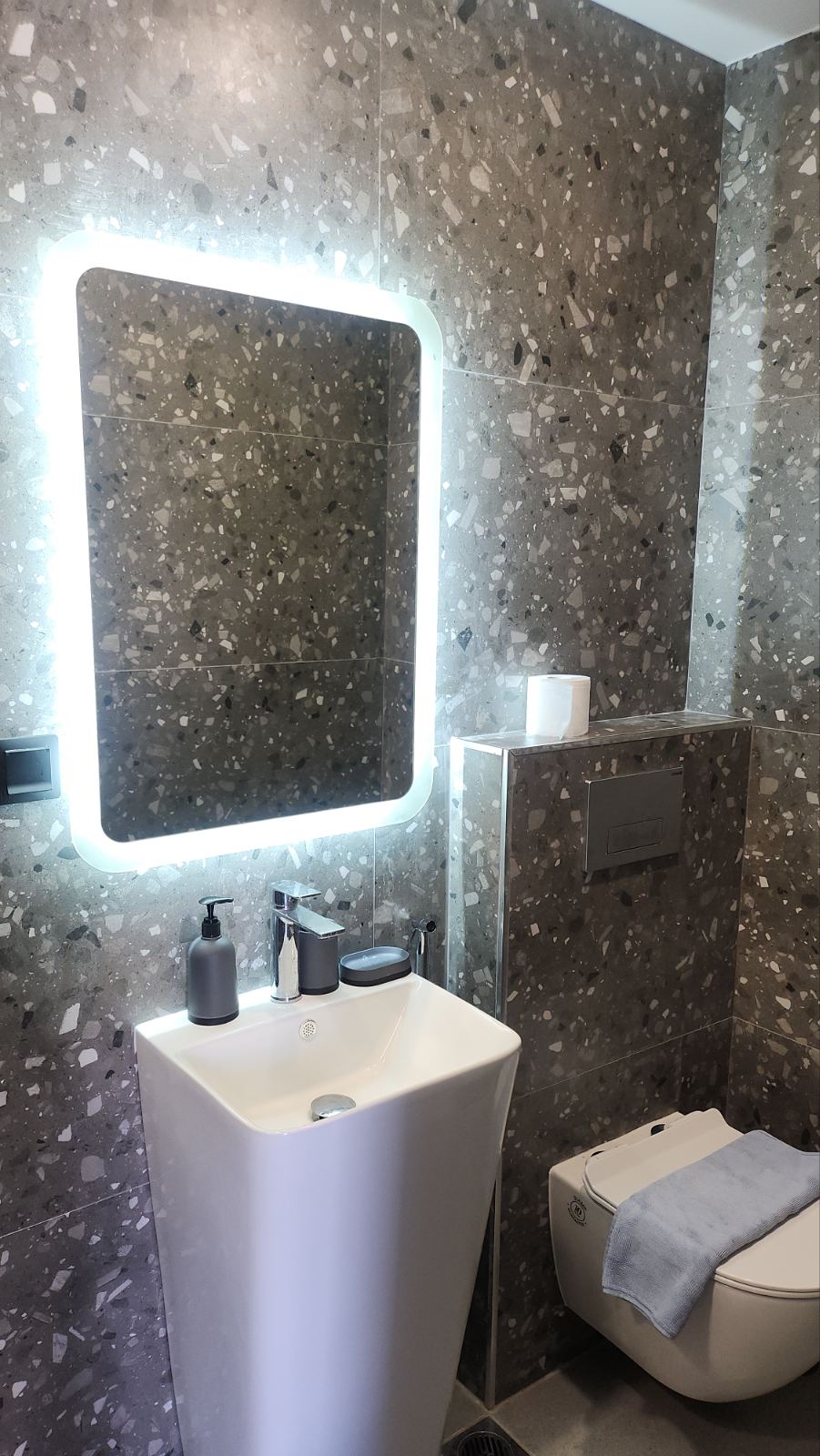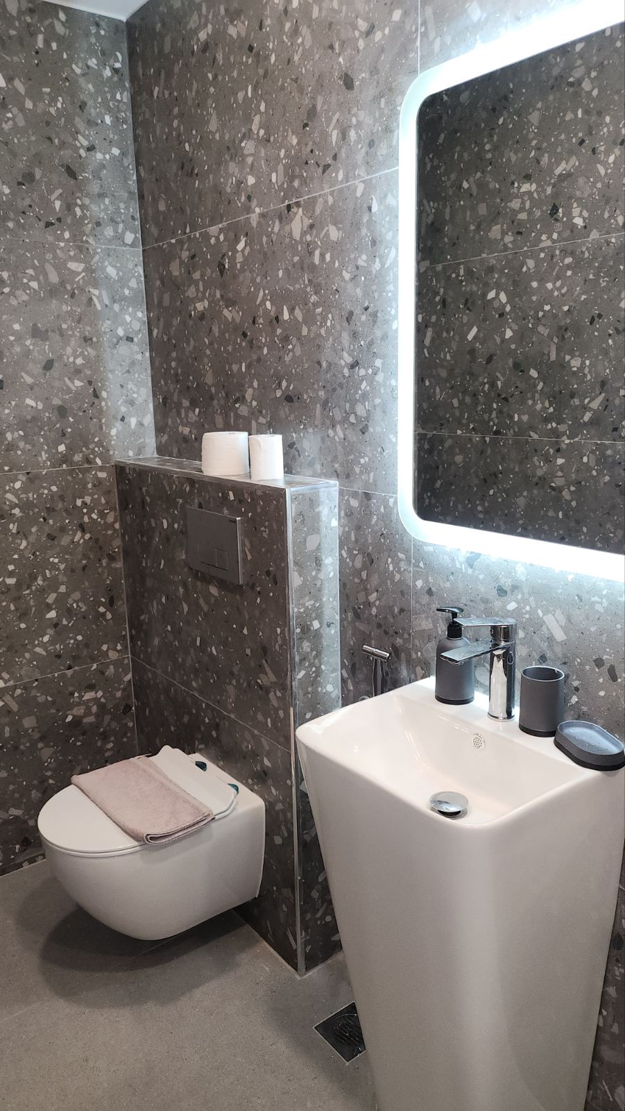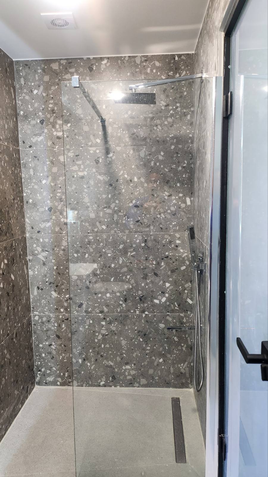 Студио број 3 (1/2) – приземје. Пространо студио, опремено со квалитетен мебел, комплетно реновиран тоалет, тераса со поглед на главната улица, опремена со маса и столови, клима, ТВ, Wi-Fi. Располага со брачен кревет.