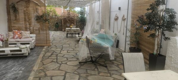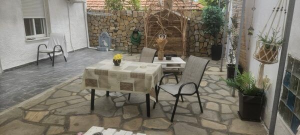 Апартманот располага со две простории.Во првата просторија е кујната која е основно опремена со кујнски инвентар за лесни оброци без пржење,голем фрижидер,ел.шпорет со фурна, аспиратор,чајник и има кревет на спуштање наменет за спиење на 1 возрасен+1 дете.Втората просторија е спланата соба во која има еден дупли кревет комотен за спиење на две лица, тв, плакар за алишта и клима уред.Од апартманот се излегува на сопствен двор декоративно среден со маса и столици и полн со зеленило.Апартманот располага со стандардно купатило и WC.