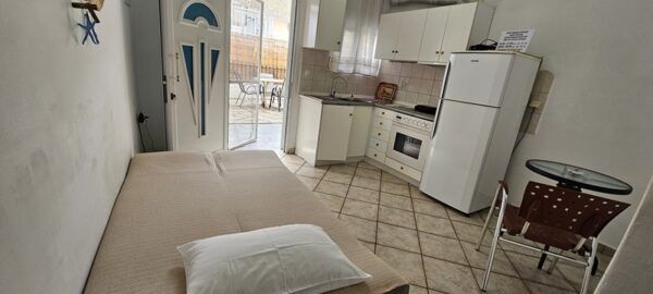 Студиото има еден дупол кревет,клима уред, кујната која е основно опремена со кујнски инвентар за лесни оброци без пржење,мал фрижидер,решо со две рингли ,аспиратор, Овде има плакар за алишта и клима уред.Од кујната се излегува на сопствен двор декоративно среден со маса и столици и полн со зеленило. Студиото располага со стандардно купатило и WC.